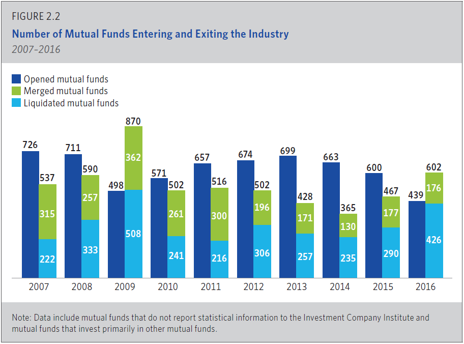 Look closely at these two charts. Note that in 2016 there were 602 mutual funds that were either closed or merged into an existing fund, compared to 128 ETF closures. In 2015, it was 467 mutual funds and 101 ETFs. As a percentage of total funds, recent closures have been nearly identical between mutual funds and ETFs – though, if you look back over the past 15 years, 58% (!!!) of U.S. stock mutual funds have disappeared. It strikes me as odd that I haven’t seen that headline anywhere.
