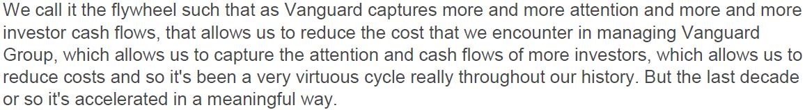 “When Vanguard releases a new ETF, it’s like Walmart coming into a new town. Every other store around that Walmart is going to be forced to lower their fees. This is similar for Vanguard because their cost ratios are so low, which is great for investors. Vanguard essentially triggers fee wars.”
