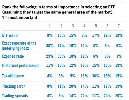 While this doesn’t necessarily come as a surprise, consider that expense ratio wasn’t cited as the most important factor in last year’s survey (though the question was posed a bit differently):