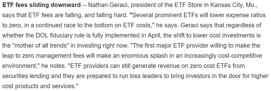 Quite frankly, given the laser-like focus on cost this year, I’m shocked we didn’t see an ETF provider make a splash with a zero cost ETF. Much has been made about the “race to zero”, but a free ETF has yet to materialize (though some ETFs are effectively free or can actually pay you to own them when adding in securities lending revenue and/or positive tracking error). The closest we came to a free ETF in 2017 was StateStreet’s SPDR Portfolio Total Stock Market ETF (SPTM) and SPDR Portfolio Large Cap ETF (SPLG), both launching with miniscule 0.03% expense ratios (or $3 for every $10,000 you invest) as part of a new suite of 15 SPDR ETFs. Maybe we’ll see zero in 2018.