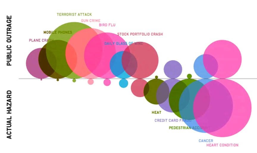 Each of us has our own unique world experiences which shape our specific fears. Some of these fears ultimately manifest themselves in our tolerance for investment risk. There’s nothing wrong with that. The key is to avoid allowing outside influences to calibrate your portfolio risk for you. It’s one thing for a naturally fearful investor to have a longer-term allocation to a conservative portfolio. It’s another thing entirely for a truly aggressive investor with a twenty-year time horizon to whipsaw themselves in and out of a growth portfolio based on financial media bluster. I’ll leave you with one of my favorite charts courtesy of Barry Ritholtz, which essentially shows media/public attention compared to actual risk for a variety of common fears (some of which have a legitimate basis and others not so much). Food for thought.