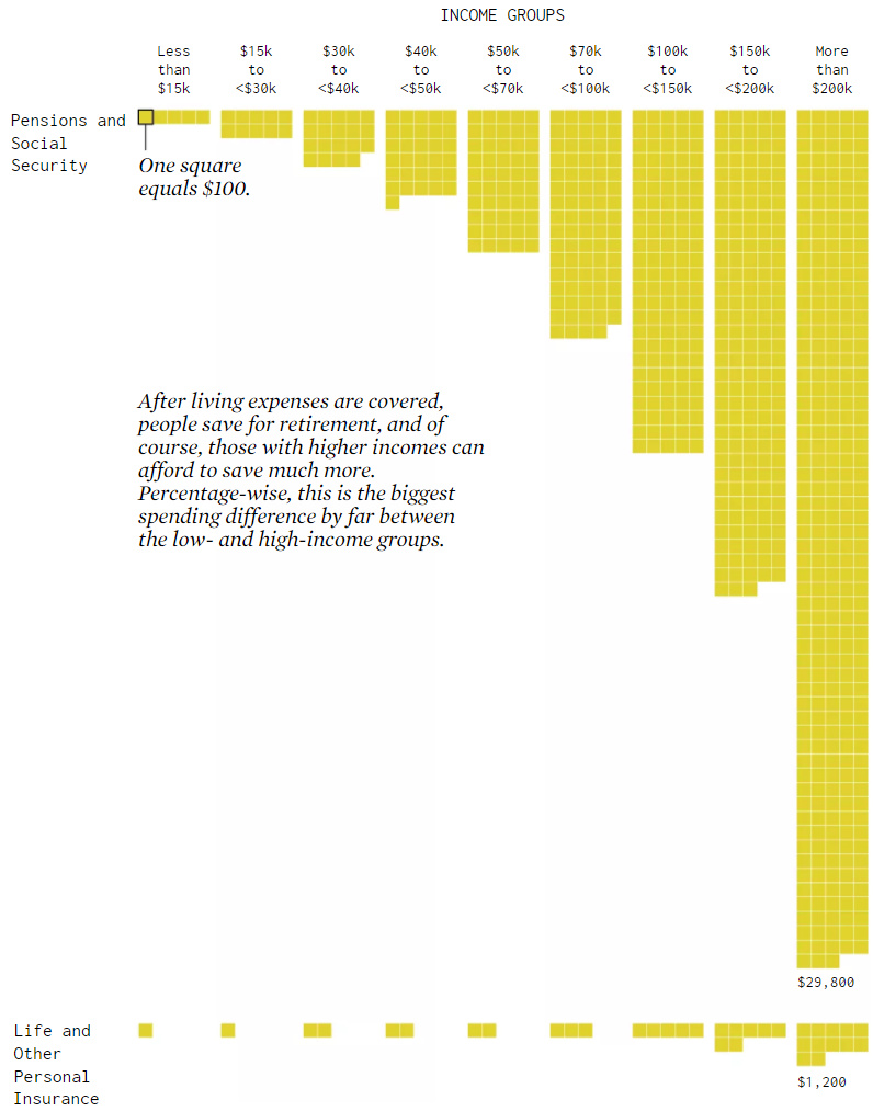 Two quick things to note here: 1) Take a look at the average total spending per year for each income group at the bottom of the chart. For lower income groups, they have to borrow money just to make ends meet. 2) Lower income groups spend a higher percentage of income to cover basic necessities: housing, foods, transportation, health care. Which leads to what I’ll call the “obvious shocker”: