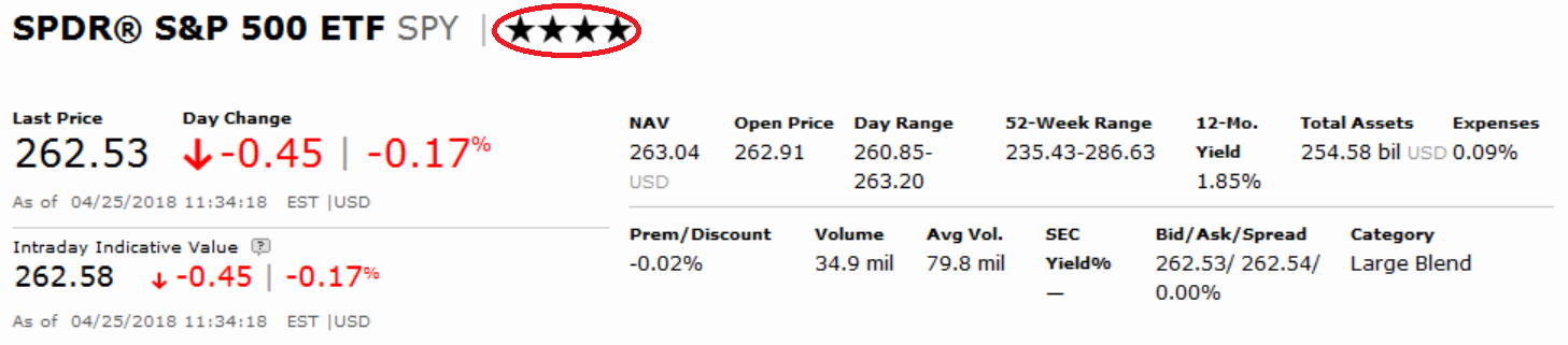 Morningstar provides their well-known “star” rating system for some ETFs. This is a backward-looking measure of an ETF’s past risk and cost-adjusted performance.