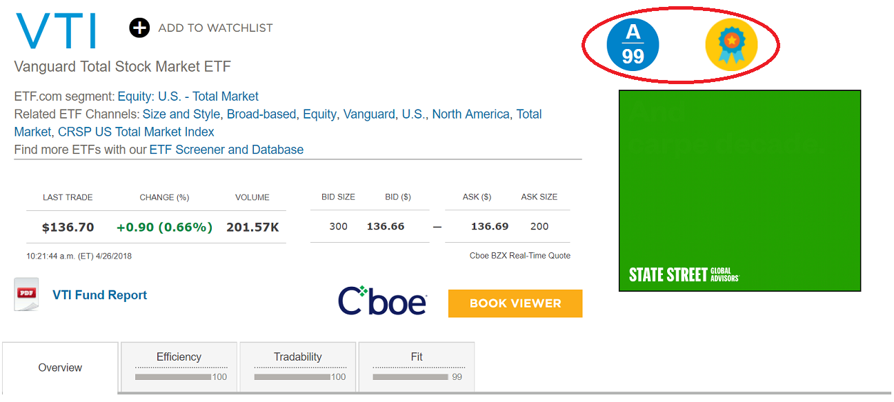 There are other ETF rating systems, some more in-depth. ETF.com offers one of the most helpful (and free) resources to kick the tires on any ETF. If you type “etf.com/” followed by an ETF ticker symbol into your browser (for example, etf.com/vti), you’ll immediately have access to a treasure trove of data, including a three-tiered rating system. ETF.com uses letter grades (“A” through “F”) and a numerical ETF “Fit” score, which together covers everything from how well an ETF accomplishes its goals to tradability to tracking error and cost. Top ETFs in each market segment also receive an “Analyst Pick” designation.
