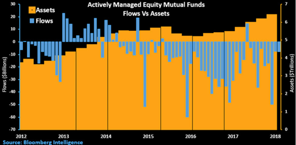 1) Despite outflows, actively managed mutual funds are still cash cows. A strong bull market has only helped generate more cash, as overall assets have grown despite investors yanking money.