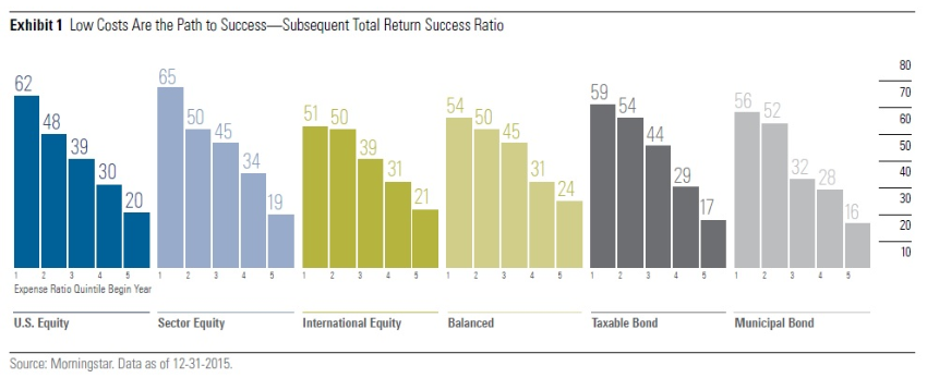 Putting the loss leader strategy aside, the fund business is simply cutthroat. Scale is more important than ever and fees matter in scaling. For fund companies, low fees have become table stakes if you want to attract investors. Regardless of Fidelity’s or any other fund company’s specific motivations, fund fees have been steadily creeping towards zero. The Schwab U.S. Broad Market ETF (SCHB) costs 0.03%. The SPDR Portfolio All World ex-US ETF (SPDW) costs 0.04%. That’s $3 or $4 for every $10,000 you invest. There are currently 34 ETFs with an expense ratio of 0.05% or less. And make no mistake about it, fund fees matter. Morningstar found that cost is the single biggest predictor of future fund success: