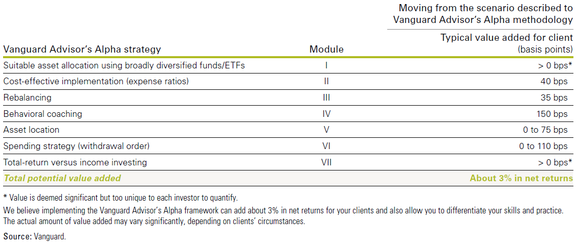 As it relates to the first question, Vanguard themselves found high-quality advisors have the potential to add about 3% annually through things like selecting cost-effective investments, disciplined rebalancing, behavioral coaching, and ensuring investments are located in proper accounts.