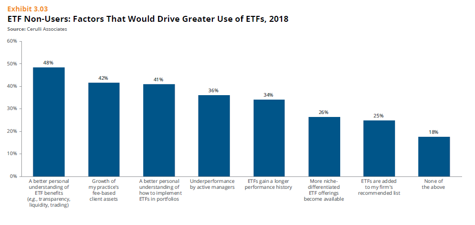 Cerulli surveyed financial advisors who currently do not use ETFs and found the single biggest factor that would drive greater use is… more education.