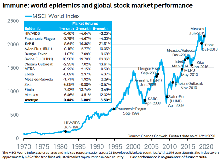 Of course, the world has experienced epidemics before: HIV, SARS, Ebola most recently. In nearly every instance, global stocks moved higher in fairly short order following the outbreak.