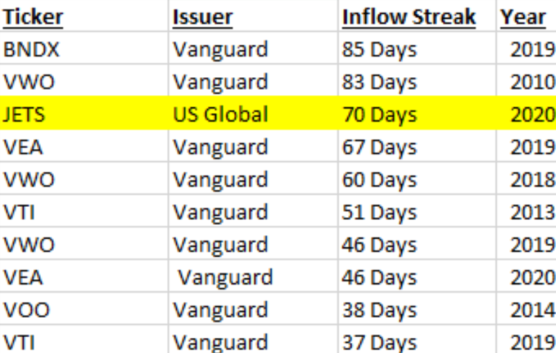 ETF Chart of the Week: Last week, the US Global Jets ETF (JETS) surpassed $1 billion in assets after beginning March with $35 million. As of yesterday, JETS’ assets stood at nearly $1.4 billion, the result of a near record-breaking 70 straight days of inflows! That’s good enough for the third best ETF inflow streak of all-time. Unsurprisingly, Vanguard dominates the rest of the top ten…