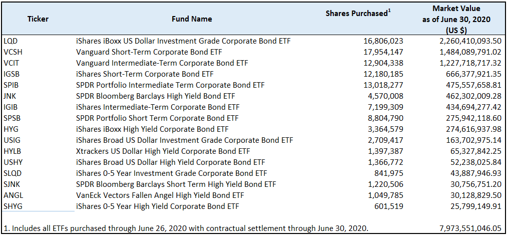 Based on their most recent data release, the Fed has purchased about $8 billion in bond ETFs and is now a top 5 holder in most of their ETF positions. Notably, BlackRock is managing the Fed’s program.