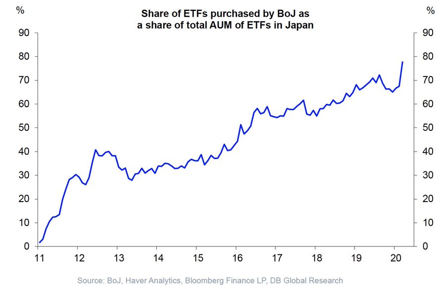 With the Fed dabbling in bond ETFs, some are wondering if stock ETFs might be next. This wouldn’t be the first time a central bank engaged in stock ETF purchases. The Bank of Japan currently owns a mind-boggling nearly 80% of the country’s ETF assets.