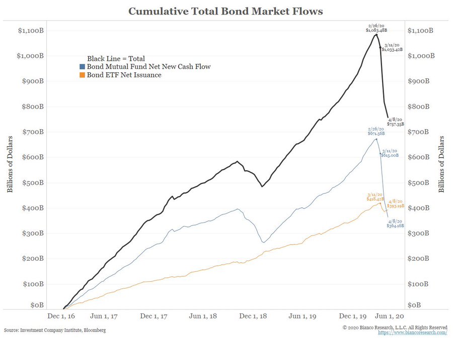 Perhaps the biggest beneficiaries of the Fed’s intervention in the bond market were mutual funds. A narrative over the past several years was that ETF investors would rush for the exit during a market crisis, causing a “death spiral”. As it turns out, mutual fund investors departed in record fashion.