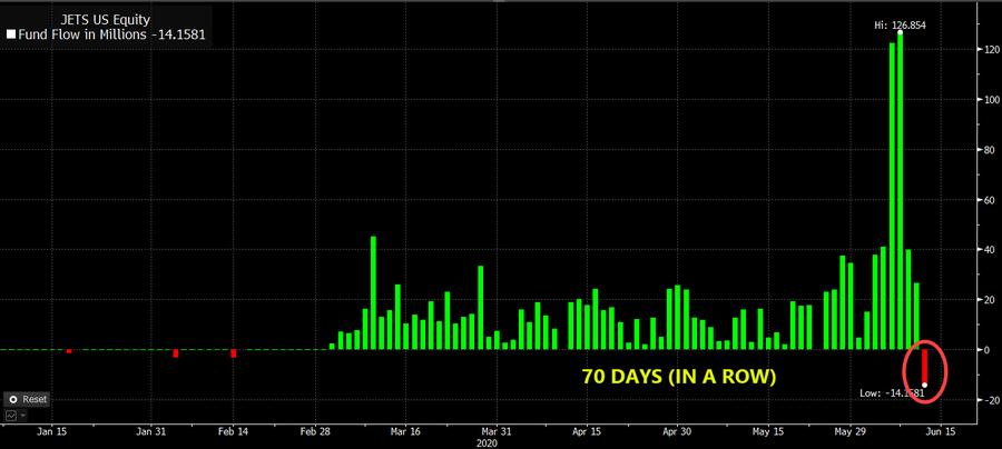 Partially driven by Robinhood traders, the US Global Jets ETF (JETS) took flight in the first half of 2020 with 70 straight days of inflows (3rd best ETF inflow streak of all-time). The ETF topped $1 billion in assets after beginning March with about $35 million!