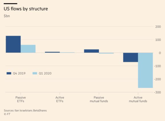 ETFs took in money during the volatile first quarter of 2020, while active mutual funds saw sizable outflows.