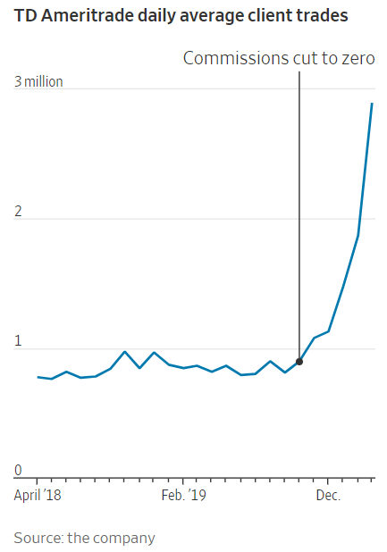 It’s difficult to pinpoint the exact reasons for the rise in retail trading, but the major brokerages shifting to commission-free trading last year is clearly a driver.