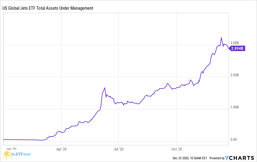 The US Global Jets ETF (JETS) began March with approximately $35 million in assets. Three months later, the ETF eclipsed $1 billion as investors bet on a rebound in airline stocks, which had taken a beating as a result of the Covid-induced economic shutdown. Today, JETS’ assets stand at nearly $3 billion! Since its launch in 2015, JETS struggled to find a wide audience. It’s always a steep climb for thematic ETFs to find success. The ones that do usually achieve it on the back of strong performance. In this case, JETS was obliterated from February into March, down over 60%. It’s the rare occasion when an ETF’s assets jump following that type of negative performance.