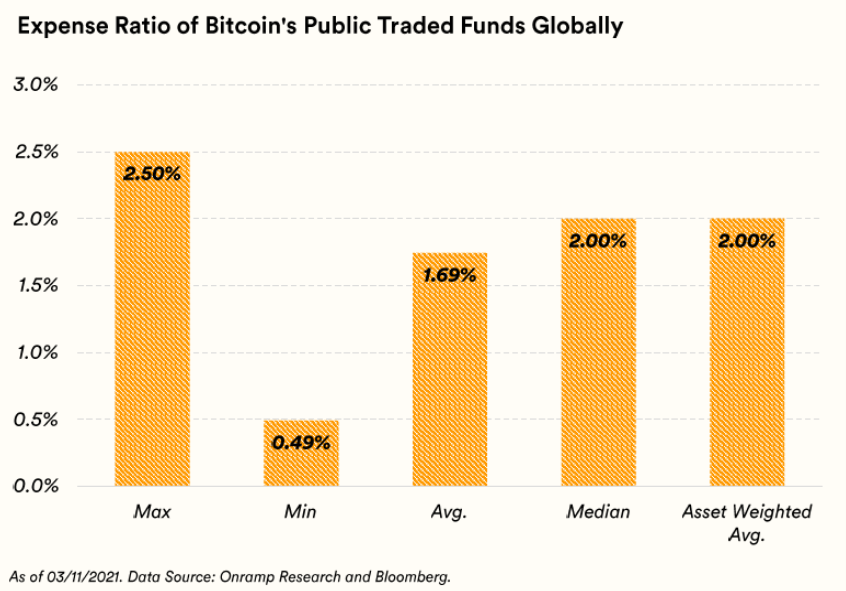 While the digital asset landscape is evolving at lightning speed and propelling financial services into the future, the ability for financial advisors to offer clients cost-effective exposure to bitcoin is still stuck in the dark ages. Consider the current most popular option for FAs, the Grayscale Bitcoin Trust (GBTC). This privately placed fund comes with a hefty price tag of 2% annually and trades over-the-counter at meaningful premiums and discounts. In fact, a look across publicly-traded bitcoin funds globally shows an average fee of 1.83%! Portly fees like that harken back to mutual funds in the 1980s.