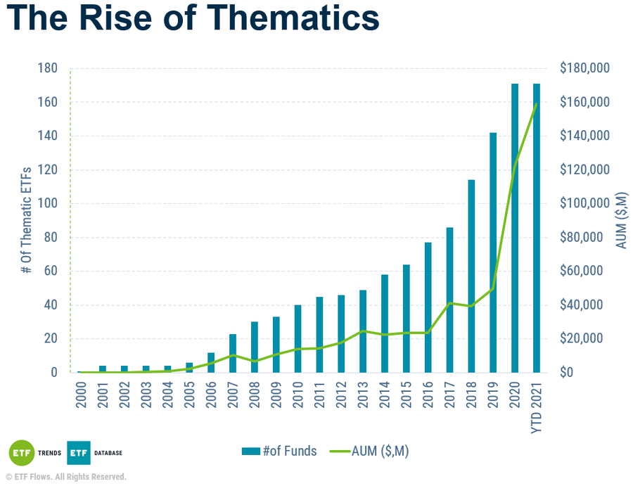 Vanguard ETFs and SPY are typically used for the core, boring part of portfolios. However, everyone likes a little sizzle. Enter thematic ETFs, which cover everything from blockchain to cannabis to disruptive innovation. Thematic ETF assets have grown from $50 billion at the end of 2019 to $160 billion as of October, a trend likely to continue in 2022.