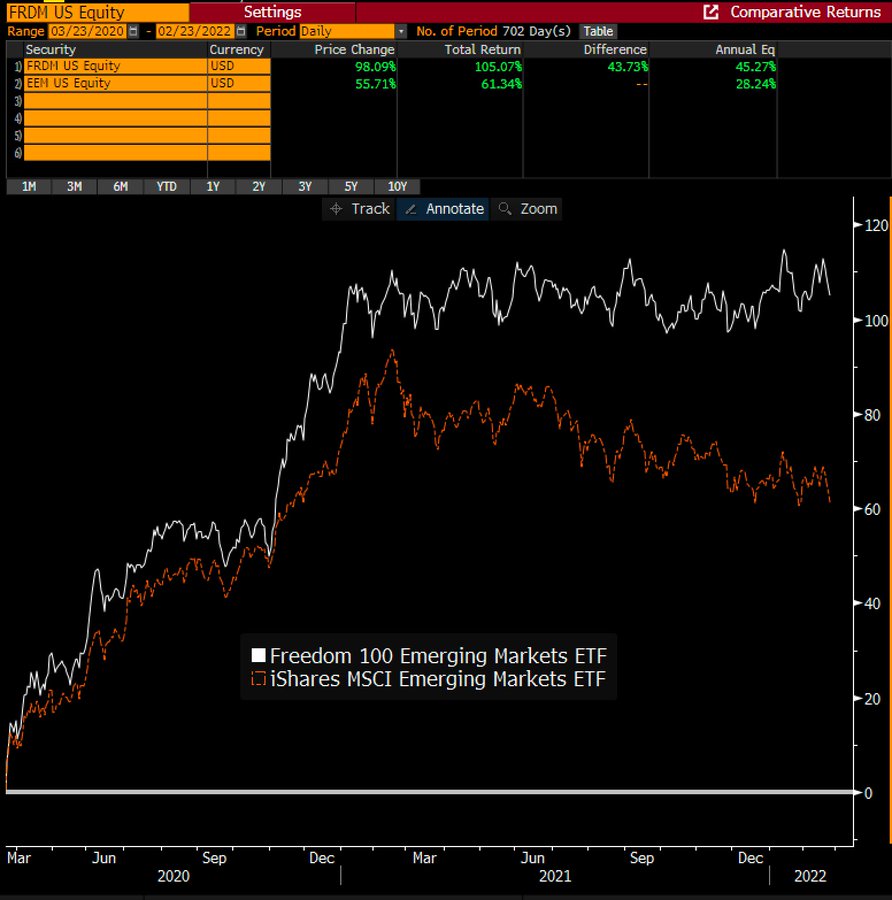 ETF Chart of the Week: Given the Russia-Ukraine war, some investors are taking a much closer look at their emerging market stock exposure. The most popular emerging market ETFs hold roughly 3% in Russian stocks. An alternative to these ETFs is the Freedom 100 Emerging Markets ETF (FRDM), a “freedom-weighted” strategy using personal and economic freedom metrics to determine holdings. As Bloomberg’s Eric Balchunas notes, this approach is serving the ETF well by avoiding China, Turkey, and now Russia.