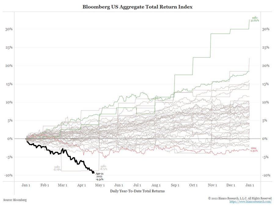 ETF Chart of the Week: Just how bad is it for bonds right now? The benchmark Bloomberg U.S. Aggregate Bond Index, which is tracked by popular bond ETFs such as the iShares Core U.S. Aggregate Bond ETF (AGG), has never experienced losses this bad.