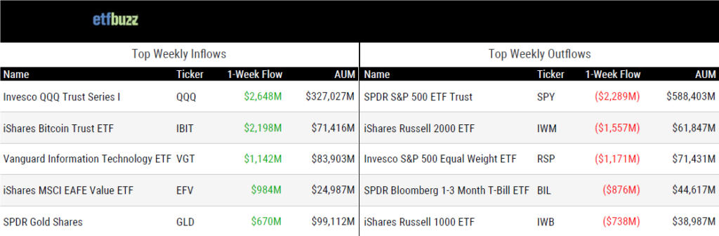 Source: ETF Action; flows and performance data as of 5/29/25; performance data excludes leveraged and inverse products